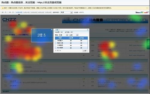 CNZZ統(tǒng)計工具在設(shè)計及研發(fā)上更加注重用戶體驗與實用性,用戶只需將關(guān)注的受訪頁面鏈接添加到“熱點圖”功能中,并保證該頁面已成功放置CNZZ“站長統(tǒng)計”代碼,第二天即可查看“熱點圖”相關(guān)數(shù)據(jù)情況。在申請開通“熱點圖”功能后,用戶可同時關(guān)注十個熱點頁面。打開某一頁面熱點圖,興趣點展現(xiàn)一目了然,圖中紅色區(qū)域表示點擊熱度最高,橙色、黃色、綠色次之,而藍色區(qū)域則表示點擊熱度最低。