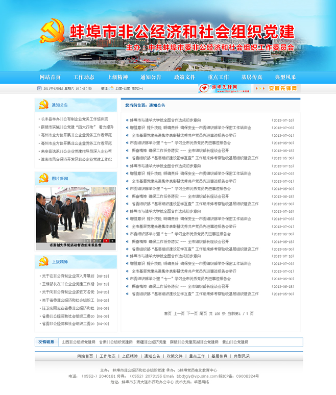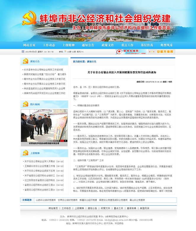 網(wǎng)頁由中共蚌埠市委非公經(jīng)濟和社會組織工作委員會,蚌埠先鋒網(wǎng)電教中心承辦,作為蚌埠先鋒網(wǎng)子欄目,主要用于蚌埠非公經(jīng)濟和社會組織黨建工作有關(guān)信息發(fā)布和經(jīng)驗交流。