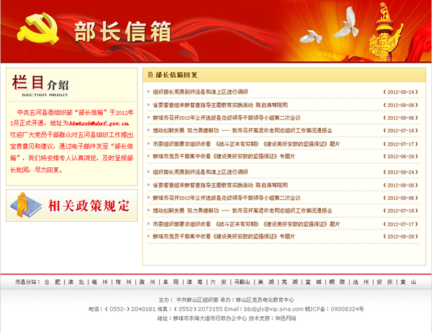 中共五河縣委組織部“部長信箱”于2012年2月正式開通,地址為bbwhzzb@ahxf.gov.cn。歡迎廣大黨員干部群眾對(duì)五河縣組織工作提出寶貴意見和建議,通過電子郵件發(fā)至“部長信箱”,我們將安排專人認(rèn)真瀏覽,及時(shí)呈報(bào)部長批閱,盡力回復(fù)。